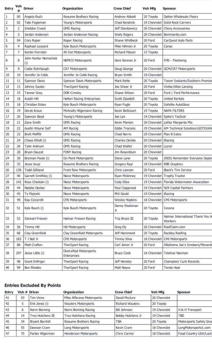 Due to the temporary increase of the field size, 40 trucks will take the green flag at Charlotte Motor Speedway. A further seven trucks who entered have been turned away due to a lack of owner points. (Editor’s note, this entry has been corrected to reflect that 40, not 0, trucks will take the green.)