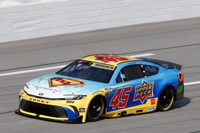For the summer race at Atlanta Motor Speedway, things got even cooler when the new Superman film came on board the hood of the No. 45. It’s another film with the great James Gunn at the helm, the second time he’s had a movie on a car in three years and comes after his switch to the DC Comics universe, which means he’s had both Marvel and DC movies as well as Marvel and DC paint schemes.