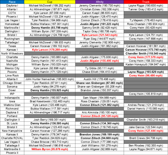 Below is a chart of the drivers that earned the bonus point (as well as the speed they ran) in every Cup, Xfinity and Craftsman Truck Series race run this year. Races where the driver went on to win are in bold, while races where the driver went on to score the maximum 61 points are in bold red. The chart has been updated through the October Martinsville weekend.